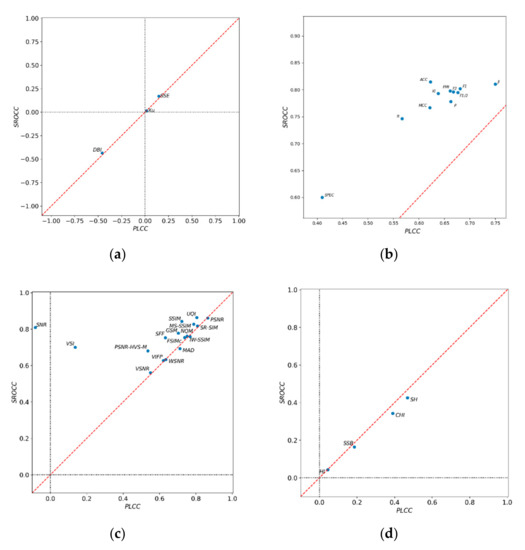 Information from Table 7, Table 8 and Table 9 is also represented as the scatterplots in Figure 6a–d, respectively, showing a comparison between PLCC and SROCC values. Vertical and horizontal axes correspond to SROCC and PLCC, respectively. Here, metrics close to the dotted red line (y = x) have similar PLCC and SROCC values. Due to very similar values for external metrics, the scatterplot scale and position in Figure 6b were adjusted. The closer metric is to the (0, 0) point, the weaker correlation with MOS for that metric is. Best results are for metrics, which are closer to the upper right corner (positive correlation with MOS) or lower-left corner (negative correlation with MOS). From the visual inspection, it can also be observed that SROCC and PLCC values themselves display strong positive linear correlation, meaning both correlation coefficients are equally important.