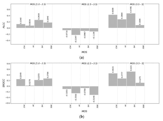 Comparison of the correlation values between different quality groups of MOS scores and internal validation scores (CHI, HI, SH, SSB): (a) PLCC, and (b) SROCC.