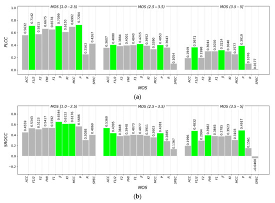 The overall correlation scores for the external validation metrics are in a tight cluster (Table 8 and Figure 6b). As presented in Table 11 and Figure 8, lower MOS values correspond to the stronger correlations. This could be explained as the respondents agreeing more when determining the lower overall quality of the segmented image [7], while the opinions for better segmentation quality differs more. For the images in the low-quality group, P, and JI show a strong positive linear correlation, MOS > 0.7. The and P metrics share a very similar correlation, as has a higher weight for P. Since there were no extended studies in this area, results in their entirety cannot be compared to previous studies. However, we observed SROCC values obtained by authors [7] for JI and metrics (0.848 and 0.848) used for single object segmentation are close to our overall SROCC values (0.811 and 0.802).