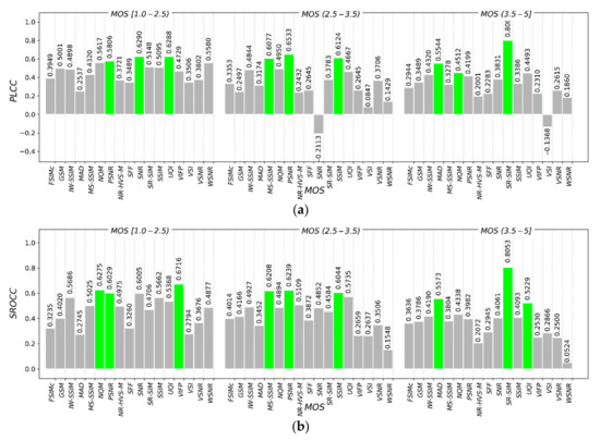 Comparison of the correlation values between different quality groups of MOS scores and FR-IQA measures (the top three best results are highlighted in light green for each quality group): (a) PLCC, and (b) SROCC.