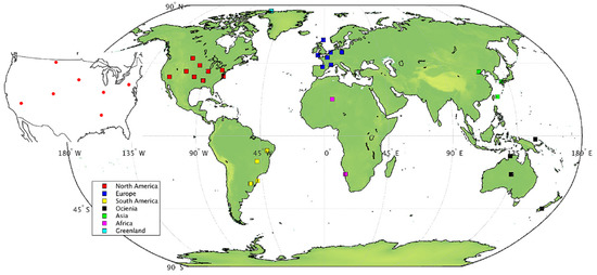 SURFRAD (circles) and BSRN (squares) sites used for validation.