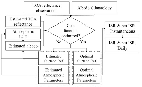 When the surface and atmospheric parameters reach an optimum, ISR and NSR are then calculated using a radiative transfer model according to Equations (4)–(6):