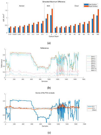 Principal component analysis of the nine VIIRS spectral reflectance: (a) Simulated maximum differences in ISR estimation over dark and bright surfaces with the first two components; (b) Original spectral reflectance over bright surfaces; (c) Scores of PCA.