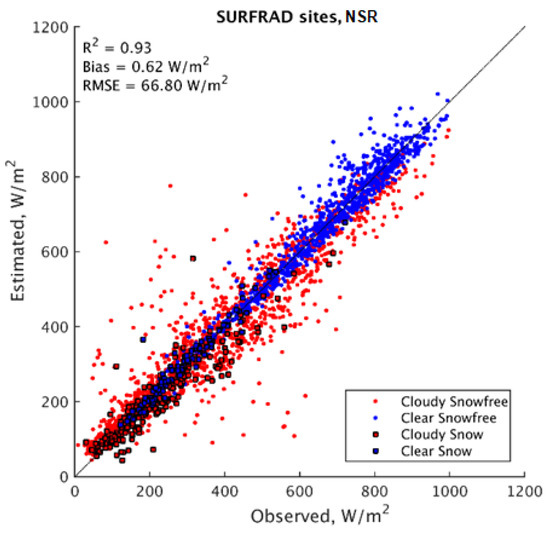The validation results of instantaneous NSR are shown in Figure 5 and Table 4. The RMSE ranges from 56.8 W/m2 to 80.87 W/m2 at the different sites while the bias ranges from −20.48 W/m2 to 14.6 W/m2. The overall RMSE and bias are 66.80 W/m2 and 0.62 W/m2, respectively.