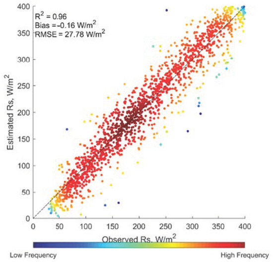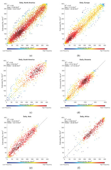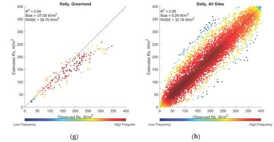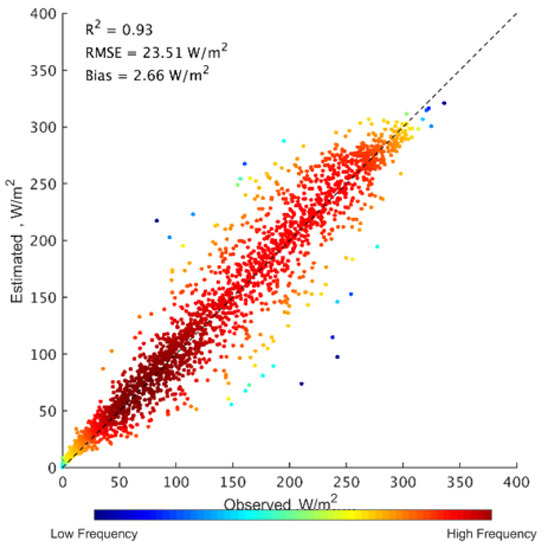 The validation results of daily ISR are shown in Figure 6 and Table 5. The ISR RMSE ranges from 24.40 W/m2 to 34.11 W/m2 at the different sites while the bias ranges from −8.60 to 10.59 W/m2. The overall daily RMSE and bias are 27.78 W/m2 and −0.16 W/m2, respectively.