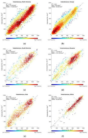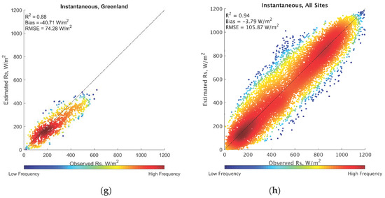 The validation results of instantaneous ISR are shown in Figure 8, Table 7 and Table 8. The ISR RMSE in each area ranges from 83.36 W/m2 to 129 W/m2 at the different sites while the bias ranges from −40.71 W/m2 to 9.48 W/m2. South America sites have the largest overall RMSE as there is more cloud in this area. Greenland site has the smallest RMSE due to the high latitude and the low absolute value of ISR. The overall RMSE and bias are 105.87 W/m2 and −3.79 W/m2, respectively.