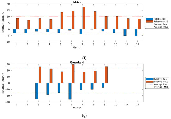 Figure 10 shows the seasonal variation of relative biases and RMSEs over the different regions. Most of the northern hemisphere sites, including North America, Europe, and Asia sites overestimate ISR in summer and underestimate in winter. Tropical and sub-tropical sites, including South America and Oceania sites, show no significant seasonal changes on biases. Greenland site shows significant underestimation as the algorithm underestimates the cloud optical depth due to the snow land surface, which should be improved in future research. Most of the sites have larger relative RMSE in winter, as the absolute ISR values are usually smaller in winter.