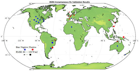 Validation results of instantaneous ISR: red circles denote sites with positive biases while blue circles denote sites with negative biases, the diameters of the circles represent the RMSEs.