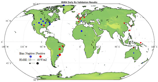 Validation results of daily ISR: red circles denote sites with positive biases while blue circles denote sites with negative biases, the diameters of the circles represent the RMSEs.