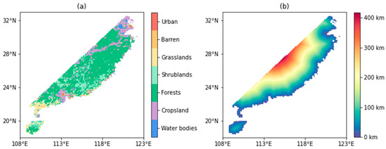 Surface types (a) and the distance to the sea (b) in study region.