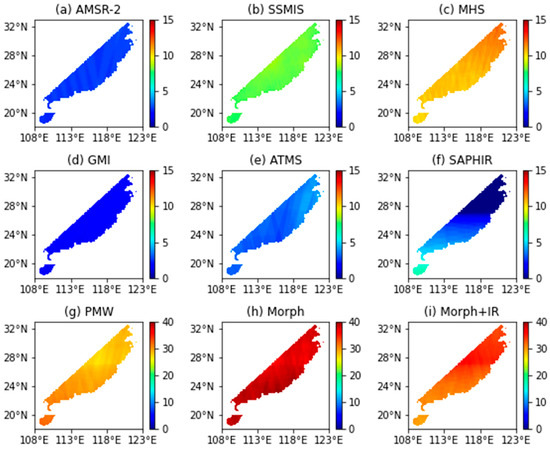 The characteristics of different PMW sensors were studied by comparing six individual PMW estimates. ATMS was prone to neglect precipitation events with the least hit proportion (4.8%) and a relatively low false alarm ratio (5.5%). GMI suffered from a similar drawback, but had better performance with a larger fraction of hits (5.1%) and fewer false alarms (5.2%). By contrast, the precipitation detectability of SSMIS far surpassed other PWM sensors with the largest hit percentage (8.4%), despite the high false alarm ratio (10.8%), which may be suitable for storm warning. Although suffering from the type I error with a high missed fraction (7.7%), MHS had superior comprehensive performance among six PWM sensors because of high hits (6.4%) and lowest false alarms fractions (4.7%). SAPHIR performed worst compared with the other five PWM sensors with high proportions of misses (7.3%) and false alarms (7.8%), and fewer hits (5.1%), notwithstanding the use of the separate Precipitation Retrieval and Profiling Scheme (PRPS) []. This may be because the insufficient data samples in the study area (only taking 0.07% of all PMW observed data) leads to unstable prediction performance. AMSR-2 had a moderate performance with a satisfying hit fraction (6.4%), but both of the two kinds of errors are significant (7.5% for misses and 7.2% for false alarms).