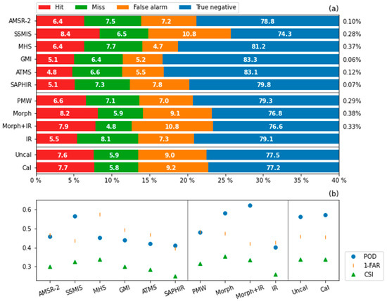 Detectability of precipitation events for 12 IMERG estimates verified against the China Merge Precipitation Analysis hourly V1.0 product (CMPA) product (a) Hit, miss, false alarm, and true negative fractions in percentage. The right column of proportion indicates the sampling weights in the corresponding “PMW” or “Uncal” data. (b) Three categorical indices, probability of detection (POD), false alert ratio (FAR), and critical successful index (CSI), for 12 IMERG estimates.