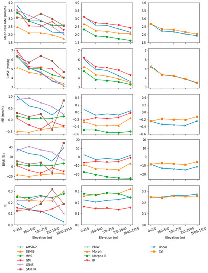 For the hit estimates, the quantitative evaluation of the elevation influences on 12 IMERG estimates was conducted using four continuous indices, RMSE, ME, BIAS, and CC, as shown in Figure 7. It is obvious that lower areas had larger conditional mean rain rates, and therefore suffered from larger random errors than the higher places on the whole.