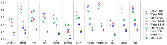 For most of the six individual PMW sensors in the first level of evaluation, urban areas benefited from the highest POD score, followed by bodies of water, and finally other areas. The POD indexes for four instruments, SSMIS, MHS, GMI, and ATMS, clearly changed, according to surface types with ranges larger than 0.1, while AMSR-2 and SAPHIR were influenced less. As for FAR, the non-urban, non-water places showed more desirable performance, with lower false alarm ratios than for the urban and water areas for all the PMW sensors, except for GMI. Considering both two types of error regarding false positives and negatives, the CSI indexes in water areas, for all PMW instruments except for GMI, were lower than in other places, but GMI had an especially extraordinary performance in water body areas, among the three surface type categories, with the most hit and least false alarm fractions.