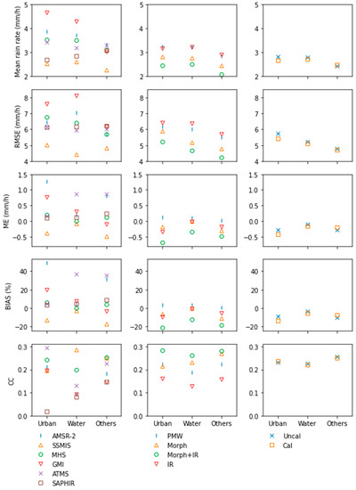 Next, the hit events were further quantitatively evaluated with four continuous indexes according to different surface types as shown in Figure 9. Among six PMW estimates, urban areas bore the largest uncertainty in the precipitation estimates, with the widest range of conditional mean rain rates, followed by water bodies, while other places had a stable performance with sufficient data samples. Four PMW estimates, GMI, AMSR-2, MHS, and SSMIS, observed more intense precipitation in urban and water areas than other places, while, abnormally, the non-urban, non-water districts became the rainiest places for SAPHIR. Generally speaking, the RMSE index had a strong positive correlation with the mean rain rate, but compared with imagers, three sounders had more consistent performances on random errors for different surface types. As for the systematic error, two sounders, MHS and SAPHIR, had better and stable performances with low biases for different surface types. Except for SSMIS and SAPHIR, most PMW sensors had higher CCs in urban areas, followed by non-urban and non-water places, and performed worst in water areas.
