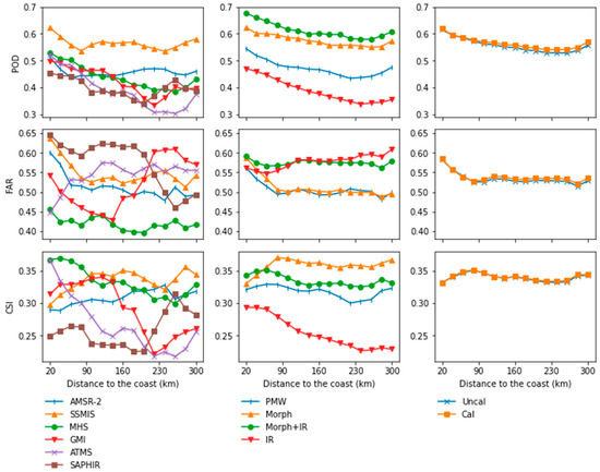 For the second level of assessment, the PODs of four precipitation estimates decreased gradually from coast to inland until about 240 km from the sea, and then increased, among which the distance to the sea had larger impacts on the IR and PMW estimates than on the morphed PMW and the mixture of PMW and IR estimates. Larger ratios of false alarms were detected in coastal areas in the range of 80 km to the sea, and the merged and morphed PMW estimates appeared to be more sensitive to the distance to the coastline than the IR and the mixture of PMW and IR estimates. Further inland, the FAR of IR estimates kept rising, however, which performed stable for the other three estimates. In general, IR had worse performance in inland (with the CSI as 0.23) than coastal areas (with the CSI as 0.29).