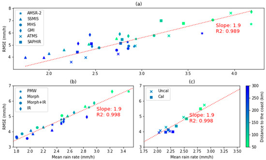The scatter plot of RMSE and mean rain rate of the hit data of 12 IMERG estimates according to different distances to the coast. (a) indicates six individual PMW estimates, and (b) demonstrates four multi-satellite estimates for the second level of evaluation, among the merged PWM, morphed PWM, the mixture of morphed PMW and IR, and IR-only estimates, and finally (c) shows the multi-satellite estimates with and without gauge calibration.