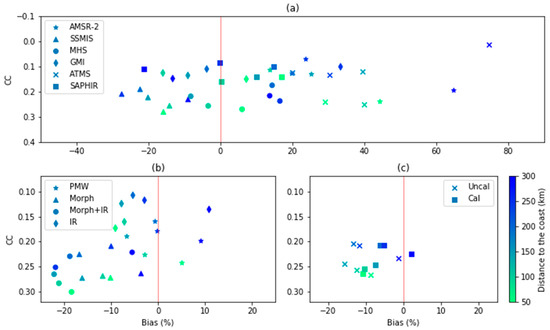 The scatter plot of CC and BIAS of the hit data of 12 IMERG estimates according to different distances to the coast. (a–c) indicate the IMERG estimates for the first, second, and third levels of evaluations.