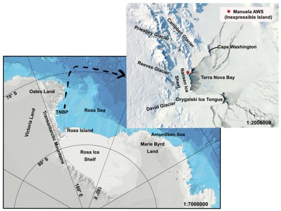 First reports about strong, persistent winds blowing in Terra Nova Bay come from the journals of the Northern Party of Robert F. Scott’s Terra Nova Expedition, which was stranded at the area throughout the winter [18]. Further observations of extreme katabatic events in Terra Nova Bay were largely limited to the summer season, as harsh, austral winter conditions of the Antarctic coast present a challenging environment for field campaigns. In consequence, scientists turned their attention toward satellite based studies [3,12,19] and numerical modelling [2,7,20]. The first observations of the atmospheric boundary layer (ABL) over the polynya were made with manned aircraft in late 1980s [12]. Since then a number of campaigns covering different branches of science have taken place in the bay, including studies of atmospheric chemistry [21], seawater chemistry [22], biology [23] and physical oceanography [24]. The first late winter measurements of the atmosphere and surface state in Terra Nova Bay have been done in September 2009 by Aerosonde unmanned aerial systems (UAS) [25] and were followed up by a second successful Aerosonde UAS field campaign in September 2012 [26], which provided a comprehensive three-dimensional description of the atmosphere over TNBP. Nevertheless, all of mentioned observations are limited to short periods of time and for now the only source of continuous meteorological data from the coastal area of the bay are Antarctic Automatic Weather Stations (AWS) installed in the region in the 1980s and maintained by the cooperative efforts of the University of Wisconsin and other partners [27]. Observations from mentioned campaigns, satellite data and AWS stations have been used in many numerical modelling studies of the katabatic wind events (e.g., [28,29,30,31,32]). In general, models perform well when it comes to large scale weather patterns but struggle to accurately represent low level properties of the atmosphere, especially over complex coastal topography [7,33]. Thus, the accuracy of the models is limited by their horizontal resolution [33]. Another reason behind model errors is representation of sea ice which, according to Bourassa et al. [34], has significant impact on models results on the wide range of spatiotemporal scales.