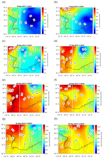 Sea level pressure maps for the Ross Sea area from MERRA dataset. Every image represents situation from a single hour of 11:30 a.m. on a consecutive days between 18 and 25 September 2020 (a–h).