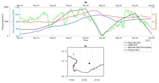 (a) Plotted together: MERRA sea level pressure from the point in the Ross Sea area and the point in Terra Nova Bay (marked in (b)), Manuela AWS wind speed and polynya surface area. (b) Location of the plots from (a).
