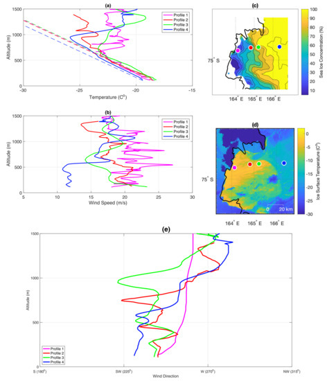 In general, UAS Aerosonde show us how complex the relationship and connections between surface, ABL and the flow from the interior of the continent is. The most intensive flows bring very cold and dry air (19 September, Figure 4) into the bay causing a drop in the temperatures (Figure 7a). As the winds drive the ice away from the shore the sea surface starts to release heat into the ABL to overcome a huge difference between air–water temperatures (up to 40 C). Intensive flow of air and decreasing sea ice cover drive the development of unstable boundary layer [60]. At the beginning of polynya development (18 and 19 September), the atmospheric conditions are more homogenous (Figure 6 and Figure 7), in response to relatively uniform surface properties and downslope flow. Whereas, when the SIC decreases, TNBP expands (Figure 5a) and the surface conditions vary between compact ice, frazil ice, sea ice floes and open water. In response, the profiles from 22 September differ from each other (Figure 8). Temperature inversion is present in the profiles further from the coast, while in those closer to the coast, where SIC is lower, temperatures decrease with height (Figure 8a). Additionally, comparison of profiles from 19 and 22 September show that very intensive winds are accompanied by low level inversion, which is absent or located at higher altitude in the profiles with lower wind speed. The development of deeper ABL in calmer wind conditions is well supported by past polynya studies [30,55,61,62].The last day of UAS Aerosonde flights is particularly interesting. In all profiles from 25 September the temperature lapse rate is approximately adiabatic, thus the convection takes place in the first 500 m (at least) of the ABL (Figure 9a). In comparison to 22 September the air above the boundary layer, near 500 m, has cooled by 5 C from conditions on the 22 September, with the pronounced inversion near 500 m on the 22nd no longer evident on the 25 September. Considering that the winds exceed 20 m/s only near the coast and in the northern part of the bay and flow from the southwest (Figure 9e), we can assume that the origins of the flow were different from the previous days. The direction of the wind (southwest) confirms our previous statement that the flow in Terra Nova Bay on this day is driven by pressure difference between Oates Land and the region of TNBP. Furthermore, we assume that weaker flow of cold air from the interior of the Antarctic on 25 September made the development of unstable conditions in a large portion of the ABL possible.