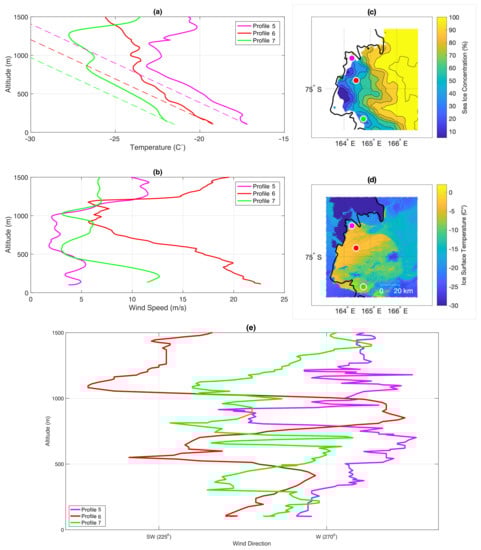 On 22 September the SIC in Terra Nova Bay is low and the polynya is significantly bigger than on 19 September, covering the area of ∼2838 km2 (Figure 5a). Consequently, a continuous transfer of heat from the surface leads to the development of unstable conditions and warming of the atmosphere. The first four profiles from 22 September show that the closer to the coast the profile is located, the colder is the air and faster the flow (Figure 8a,b). Temperature increases with the distance offshore from −20 C to −17 C and wind speed decreases from ∼24 m/s to 10 m/s in the lowest layer of the flights (Figure 8b). In the first two profiles the temperature lapse rate is dry adiabatic up to a height of ∼200 m and up to ∼400 m in profiles 3 and 4. However, a stable ABL is present at the bottom of profiles 3 and 4 probably due to increasing SIC at these locations and limited transfer of heat. The dry adiabatic lapse rate above this shallow, stable layer reflects the remnants of convection from further upwind. The dominating wind direction in all profiles is west-northwest up to ∼500 m, changing to south-southwest and finally southeast with altitude (Figure 8e). In general, profiles 1–4 differ from each other up to height of ∼500 m indicating the extent of the ABL influenced by the TNBP. Furthermore, the warming and deepening of convective boundary layer in the lowest 200 to 400 m in the profiles from 22 September is a classic picture of air mass modification above polynya [30,55].