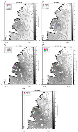 Location of the UAS Aerosonde profiles with maps of AMPS sea ice concentration for profiles 1–4 from 18, 19, 22, 25 September 2012 (a–d) and profile 5-7 from 25 September 2012 (e).