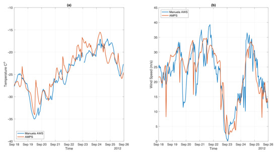 Observations from Manuela AWS station and model results from the nearest point to Manuela AWS location for (a) temperature and (b) wind speed between 18 and 25 September 2012.