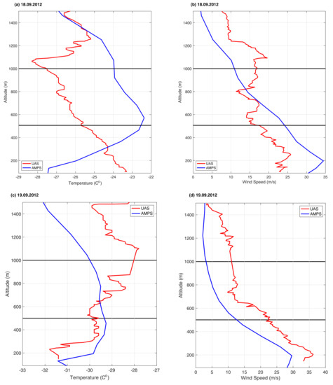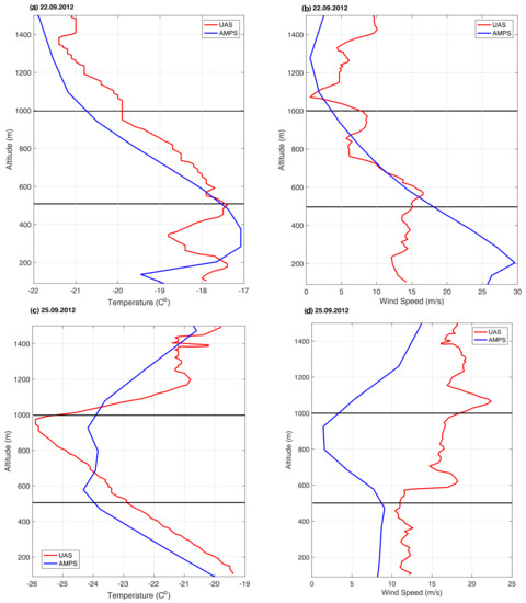 Exemplary profiles from UAS Aerosonde observations and AMPS model results. (a,b) Profile nr 3, 22.09.2012. (c,d) Profile nr. 4, 25.09.2012.
