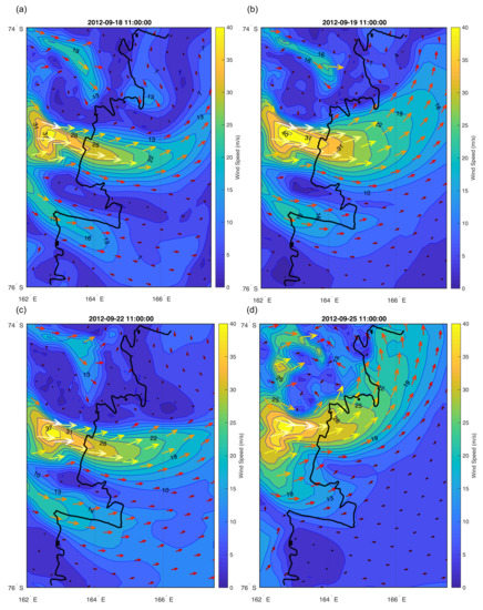 AMPS model wind speed results for Terra Nova Bay region for the days of UAS Aerosonde flights, (a) 18, (b) 19, (c) 22, (d) 25 September 2012.