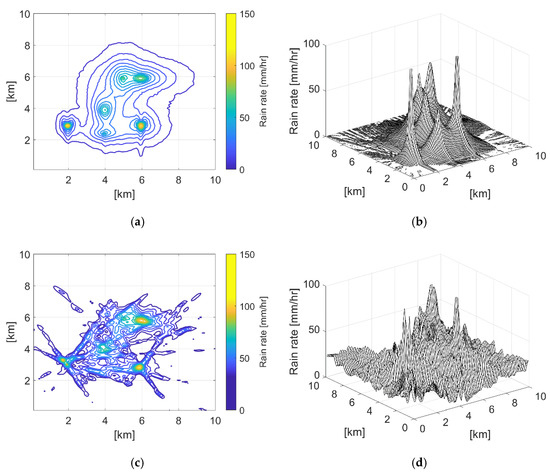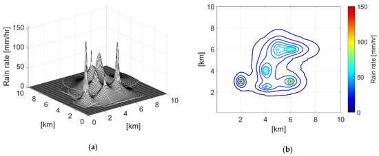 In Figure 3 a small-scale, simulated rain field can be seen in a 10 × 10 km area. The individual rain cell parameters were randomized by taking into account real radar observation of a rain cell in Europe, Karlsruhe [33] to limit the peak rain intensity below Rmax = 162 mm/h and the Gaussian components are (aG, bG, aE, bE ) ≤ 1.5 km. For the separation confoustant R1 = 35 mm/h was applied.