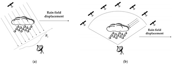 Figure 4. (a) Parallel-beam projections of the rain field, recording during displacement; (b) recording multiple parallel-beam projections by receiving multiple geostationary satellites.
