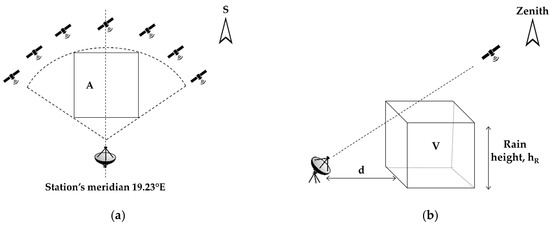The distance of the station to the north of the monitored area is d as shown in Figure 5b. In the original EXCELL model, the rain cells have a constant vertical rain intensity profile up to the rain height hR, according to ITU-R Rec. P.839 [38,42]. By applying this assumption, the distance d may be estimated with Equation (7):