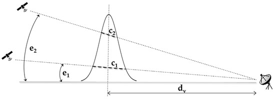 The number of projection angles influences the quality of the reconstruction [47]. Selecting a feasible number of received satellites may lead to an optimal solution considering the cost and complexity of the receiver system against the required reconstruction quality. The impossibility of receiving GEO satellites with a very low elevation angle narrows the optimal 0–180° projection range [48]. In this paper, for the simulations and rain field reconstruction, the width of this range is 144.2°. In traditional tomographic methods all projections are created on the same plane. The present method, by receiving GEO satellites, does not meet this condition, considering the variable elevation angle of the received satellites, as depicted in Figure 6.