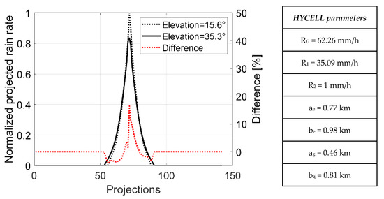 Figure 7. Rain intensity projection values for the lowest and the highest elevation angles calculated with Equation (9) for a single rain cell with the given parameters.