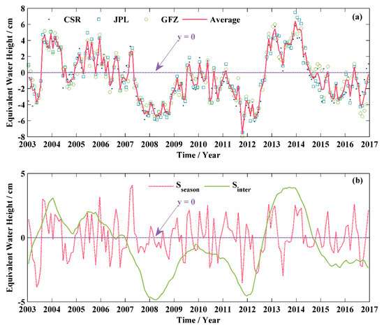 Time series of terrestrial water storage anomalies (TWSA) in Northeast China from 2003 to 2016 calculated on the basis of Gravity Recovery and Climate Experiment (GRACE) data: (a) time series of TWSA estimated using CSR (the Center for Space Research at the University of Texas at Austin), JPL (the Jet Propulsion Laboratory), and GFZ (the German Geosciences Research Center) solutions and their average; (b) interannual and seasonal signals of TWSA in Northeast China.