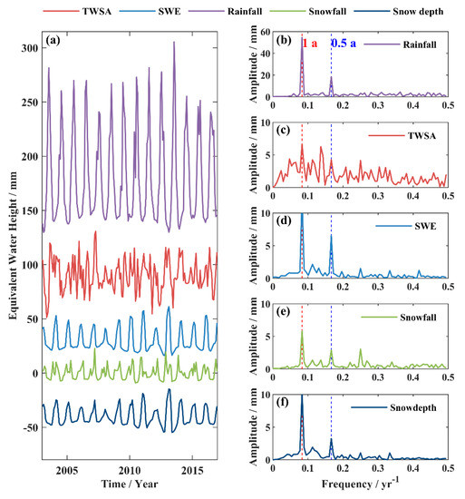Prior research has generally assumed that TWS and precipitation are the sums of linear variations, interannual variations, and semi-annual variations [32]. To obtain the phase and amplitude of TWSA, snowfall, rainfall, snow depth, and SWE, we used the least squares method to fit these time series. The annual and semi-annual cycles were also considered in the following equation [60]: