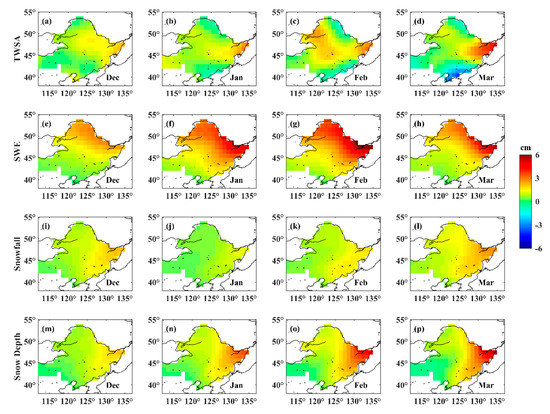 The spatial distribution of monthly variation of TWSA, snow water equivalent (SWE), snowfall, and snow depth in Northeast China (SWE, snow depth, and TWSA results were anomalies relative to their November values): (a–d) the spatial distribution of monthly variation of TWSA from December to March; (e–h) the spatial distribution of monthly variation of SWE from December to March; (i–l) the spatial distribution of monthly variation of snowfall from December to March; (m–p) the spatial distribution of monthly variation of snow depth from December to March.