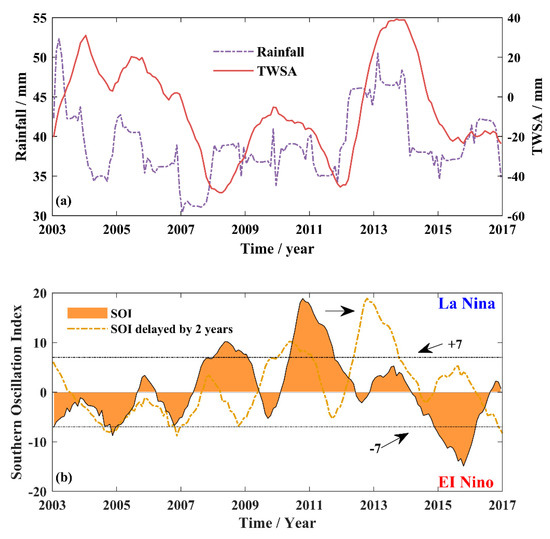 ENSO is an important factor for short-term climate predictions [63]. In China, ENSO events have a clear modulation effect on climate anomalies [32]. Here, we studied the response of TWS and rainfall to the ENSO phenomenon on an interannual scale in Northeast China. The interannual variation time series of TWSA, rainfall, and SOI are shown in Figure 8. When the time series of SOI was shifted back 2 years, we could tentatively conclude that the shifted SOI time series had an improved consistency with rainfall and TWSA series, as shown in Figure 8a. This preliminarily indicated that rainfall and water storage in Northeast China are influenced by the ENSO phenomenon, but that there is a lag of about 2 years.