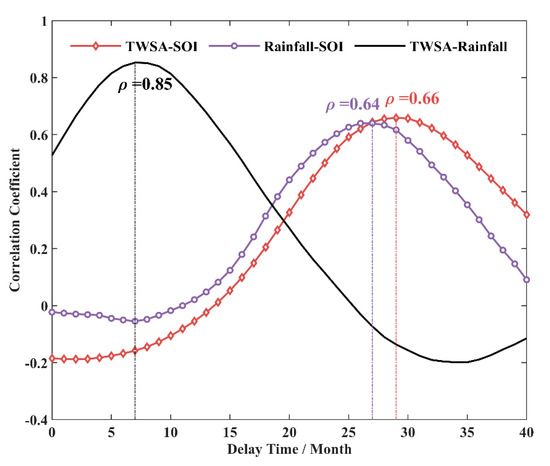 Correlations among the interannual time series of SOI, TWSA, and rainfall from 2007 to 2016. A time lag range of 0–40 months was selected to analyze the correlations among the interannual time series of SOI, TWSA, and rainfall from 2007 to 2016. TWSA-SOI represents the delayed correlation curve between TWSA and SOI interannual time series, Rainfall-SOI represents the delayed correlation curve between rainfall and SOI interannual time series, and TWSA-Rainfall represents the delayed correlation curve between TWSA and rainfall interannual time series.