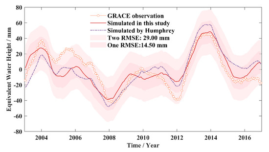 We used n = 16 and a = 0.4 to simulate the contribution of rainfall to the interannual TWSA from 2003 to 2016 (Figure 11). To be consistent with the simulated rainfall averages over the same timeframe, we implemented the GRACE results using a sliding average of 12 months. The RMSE value between GRACE and simulated result was 14.5 mm, and its RMSE difference was lower than 17% of the TWSA interannual variation, thus verifying the reliability of the model for the influence of rainfall on interannual land water storage changes in Northeast China given in this paper. In comparison, we calculated the simulation results of TWSA in Northeast China from 2003 to 2016 using data from the climate-driven water storage change model provided by Humphrey and Gudmundsson (2019) [68]. The results are shown in Figure 11, and all series were calculated on the basis of a 12-month sliding average. The model reconstructed by Humphrey and Gumundsson (GRACE-REC) showed a trend apparently larger than the long-term change of GRACE observations. We used a simpler reconstruction method than that of Humphrey and Gumundsson but yielded observations that were more consistent with GRACE.