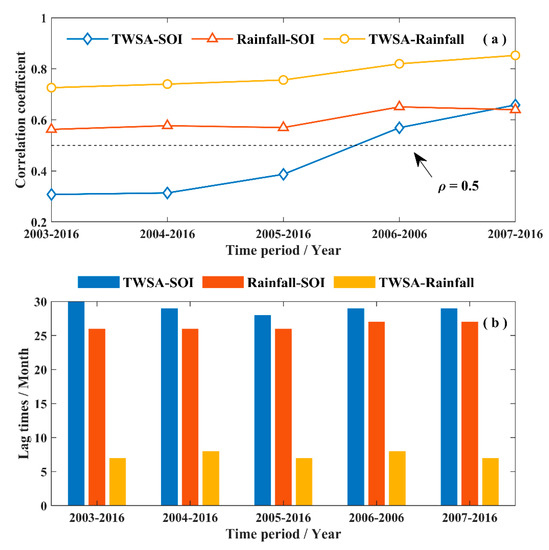 Results of correlation analysis over different periods: (a) correlation values among TWSA, rainfall, and SOI over different time spans; (b) time lags among TWSA, rainfall, and SOI over different time spans.