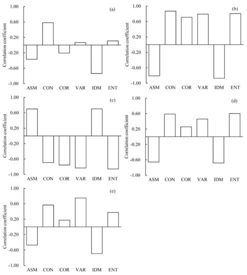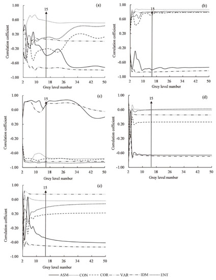 Correlation coefficients for textural parameters and biomass under different grey level numbers: (a) blue band, (b) green band, (c) red band, (d) red-edge band, and (e) near infrared band.