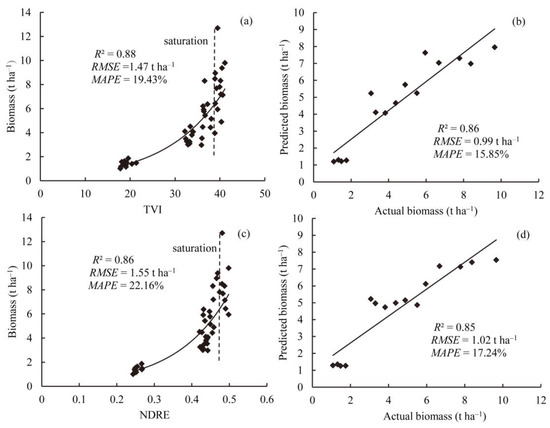 Results when using the triangular vegetation index (TVI) and normalized difference red (NDRE) indices to estimate the biomass. (a) Calibration results for TVI, (b) validation results for TVI, (c) calibration results for NDRE, and (d) validation results for NDRE.