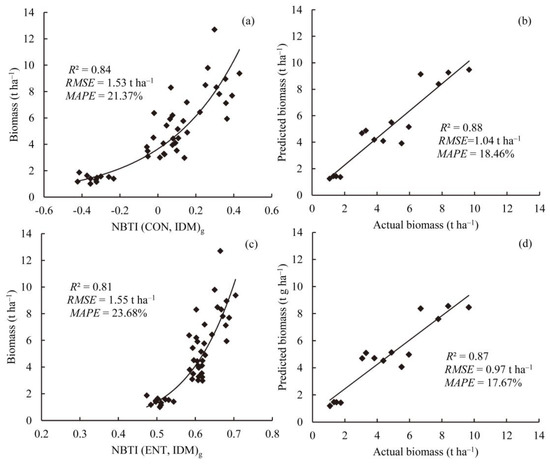 Results when using NBTI (CON, IDM)g and NBTI (ENT, IDM)g to estimate the biomass. (a) Calibration results for NBTI (CON, IDM)g, (b) validation results for NBTI (CON, IDM)g, (c) calibration results for NBTI (ENT, IDM)g, and (d) validation results for NBTI (ENT, IDM)g.