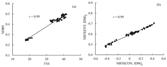 Relationship between (a) TVI and NDRE and (b) between NBTI (CON, IDM)g and NBTI (ENT, IDM)g.
