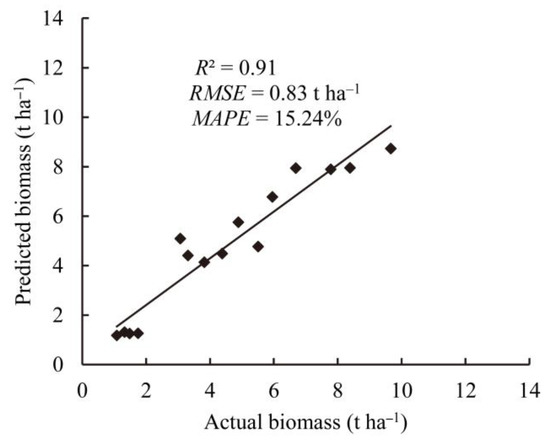 Based on the stepwise regression model proposed in this study and the calibration dataset, the best models used to estimate biomass (spectral indices, textural indices, and both spectral indices and textural indices) have R2 values of 0.88, 0.84, and 0.89, respectively, which are described by Equations (3)–(5), respectively, as follows: