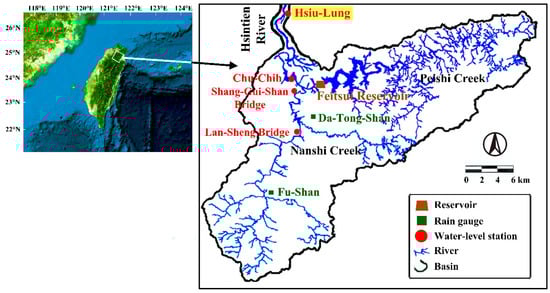 The Hsintien River is located in northern Taiwan (Figure 1), with a drainage area of approximately 916 km2 and a total length of 84.6 km [42]. The Hsintien River catchment area contains two main tributaries, Nanshi Creek and Peishi Creek. The source of the Peishi Creek is at an altitude of approximately 600 m, and the Feitsui Reservoir is located within its basin. The Feitsui Reservoir, the second-largest reservoir in Taiwan with a total storage capacity of approximately 406 million m3, was established in 1981 to ensure the stability of the tap water supply to the Taipei Metropolitan Area [43]. The source of Nanshi Creek is at an altitude of approximately 1300 m. It passes along the Lan-Sheng Bridge and the Shang-Gui-Shan Bridge water level stations and then the Chu-Chih and Hsiu-Lung stations after merging with the Peishi Creek. Table 1 lists the elevation information regarding these water stations. Located in the densely populated Taipei Metropolitan Area, the Hsiu-Lung station monitors the river flood stage to prevent overflows and floods. Therefore, the water level measured at the Hsiu-Lung station as the research objective was selected.