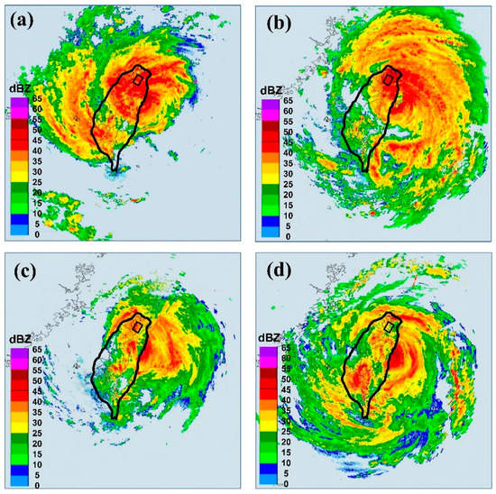 Radar reflectivity images from typhoons’ approach to Taiwan: (a) Typhoon Saola (2 August 2012, 0300 local standard time (LST)), (b) Typhoon Soudelor (8 August 2015, 0400 LST), (c) Typhoon Dujuan (28 September 2015, 1800 LST), and (d) Typhoon Megi (27 September 2016, 1400 LST).